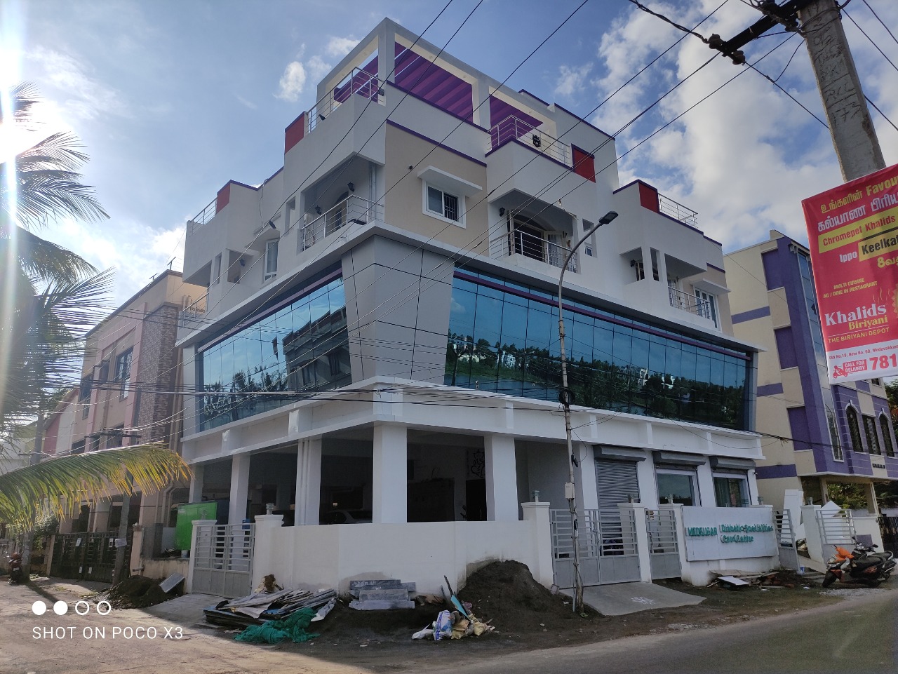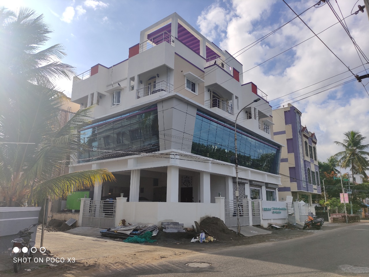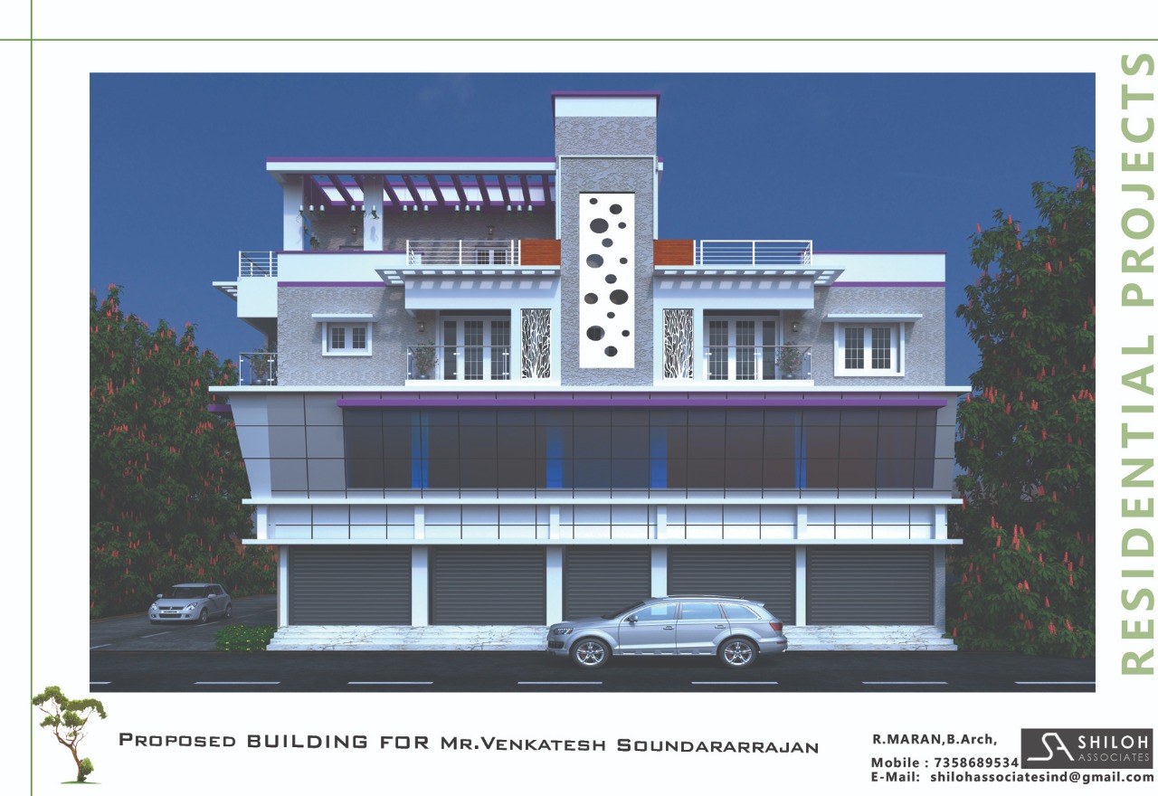 This mixed type of building located in Madipakkam, Lake Street [opp-Lake] Ground and First Floor full of commercial with ACP [ALCO PANEL], Glazing stunning contemporary Elevation and Second floor full of Residential. Elevation: Equally balancing with symmetrical Contemporary ACP and Glazing structure and textured paint.