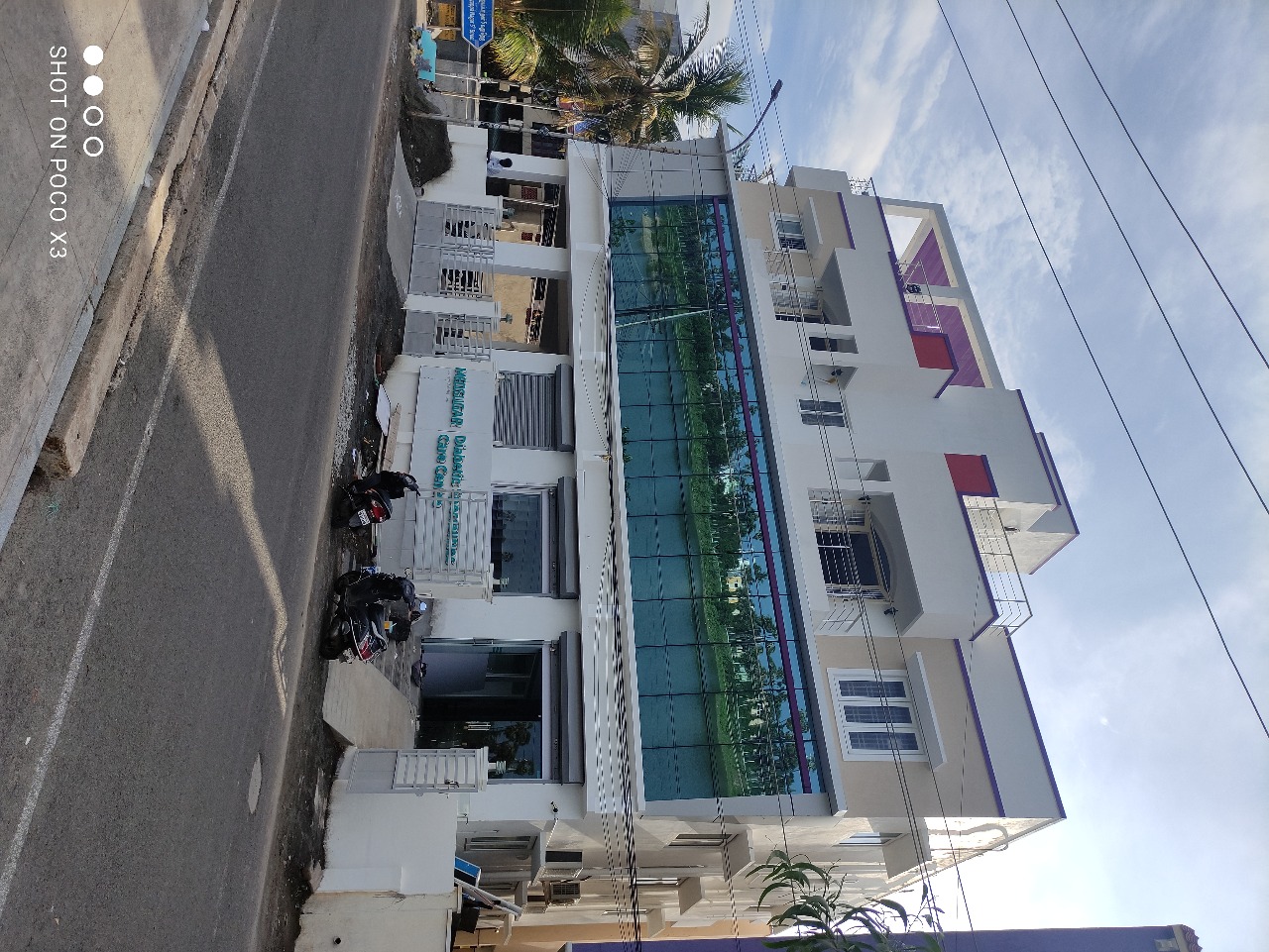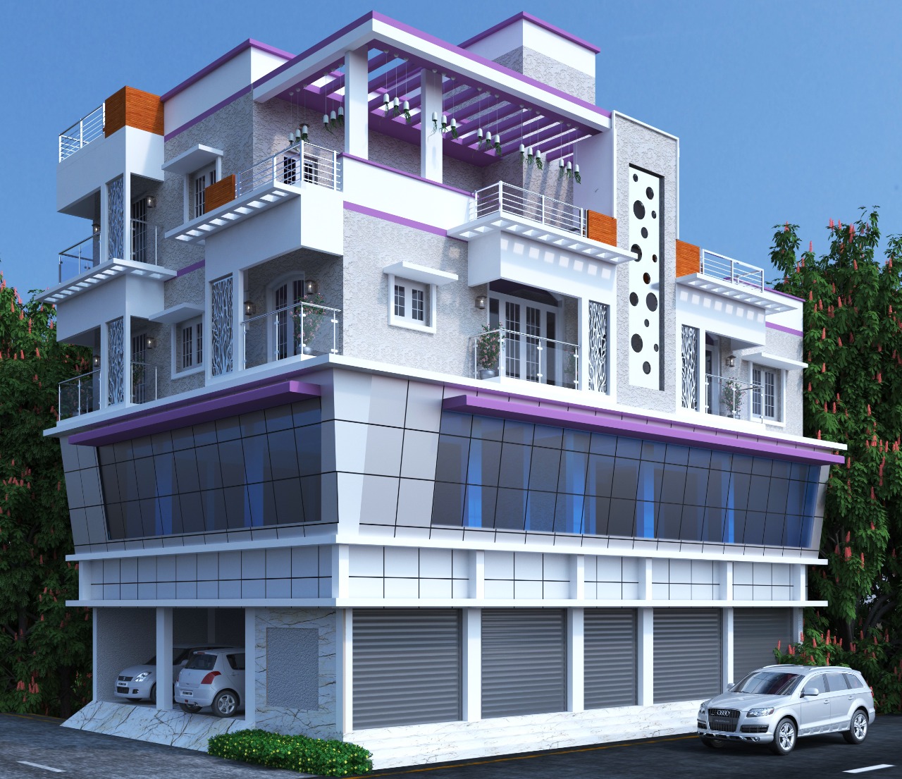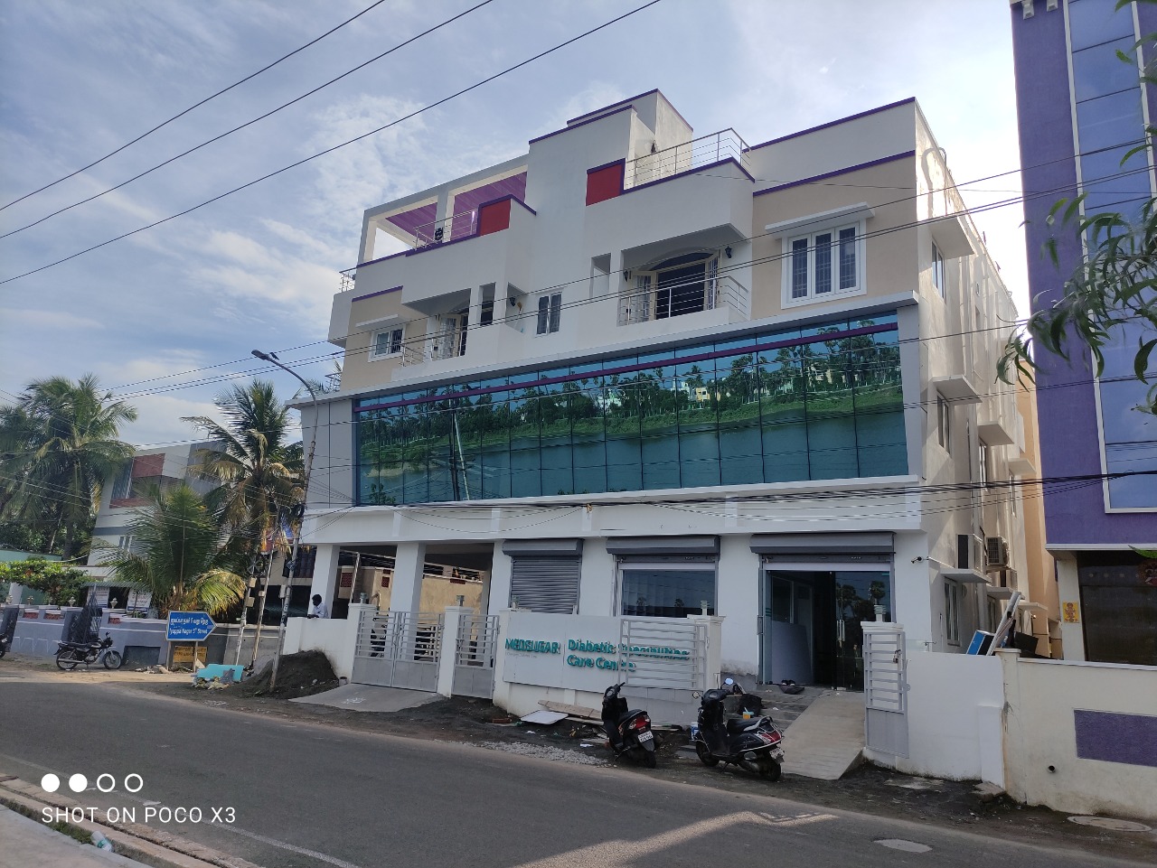 This mixed type of building located in Madipakkam, Lake Street [opp-Lake] Ground and First Floor full of commercial with ACP [ALCO PANEL], Glazing stunning contemporary Elevation and Second floor full of Residential. Elevation: Equally balancing with symmetrical Contemporary ACP and Glazing structure and textured paint.